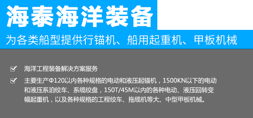 江蘇海泰海洋裝備有限公司位于素稱“銀杏之鄉(xiāng)”的泰興市,2018年投資建設(shè),至今已經(jīng)成為產(chǎn)品研發(fā)、生產(chǎn)制造,調(diào)試服務(wù)為一體的設(shè)備配套企業(yè)。公司從事海洋裝備(設(shè)備)及配件的制造、設(shè)計(jì)、安裝,維修;船用錨機(jī)、絞車、起重機(jī)、舾裝件、電氣設(shè)備、環(huán)保設(shè)備設(shè)計(jì)、制造。公司成立以來(lái),就與中國(guó)船舶工業(yè)集團(tuán)公司第701所、702所、704所、708所、上海船舶研究設(shè)計(jì)院等多家船舶科研院所建立了技術(shù)合作關(guān)系,產(chǎn)品應(yīng)用于......